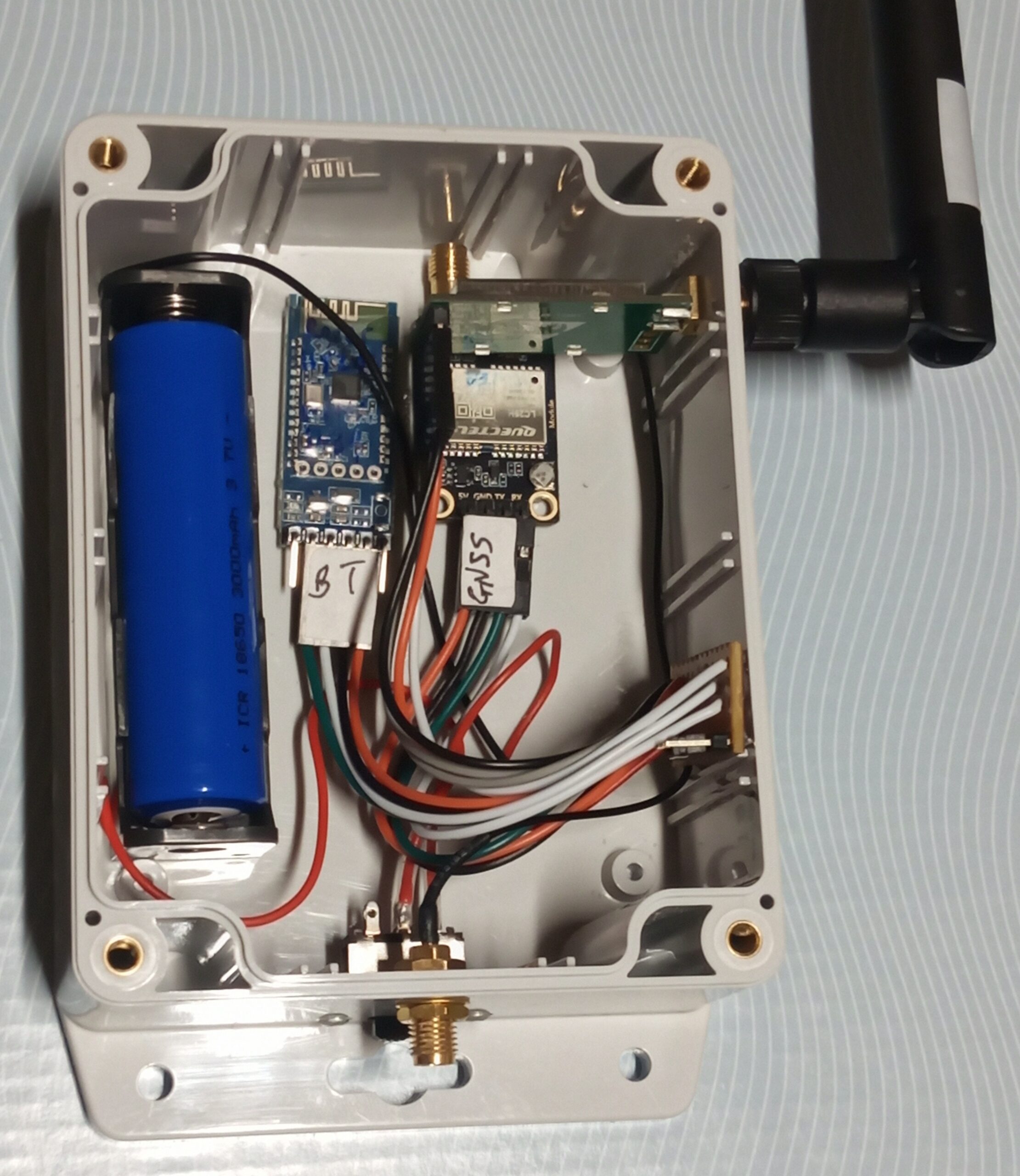 The final step is to replace the wire with a LoRa link. The rover GNSS should have its TX connected to the BT RX – this will send the NMEA messages out over Bluetooth. The rover RX should be connected to the TX of the E22 module with address = 0. This is how it gets the RTCM RTK messages. The base station GNSS TX should be connectd to the RX of the E22 module with address 65535 (FFFF hex). The base station will probably also need either another BT module or a USB serial adapter connected so that the survey-in command can be sent (and survey-in process monitored via the $PQTMSVINSTATUS messages). It is OK for the base station GNSS TX to be connected to both LoRa E22 RX and USB serial adapter RX. Use separate power sources for each of the rover and base.